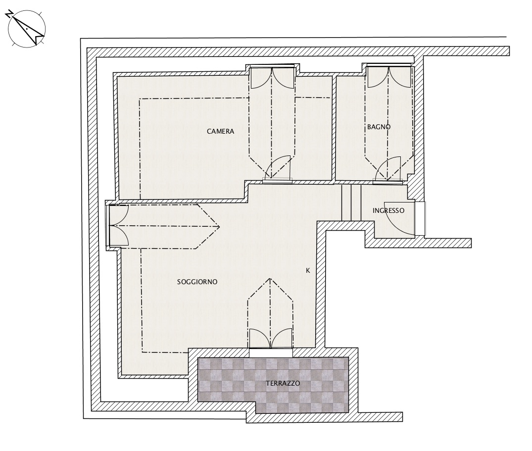 Internamente l’appartamento è composto da ingresso, soggiorno con angolo cottura, camera matrimoniale molto grande con lo spazio per un letto singolo , bagno e terrazzo.