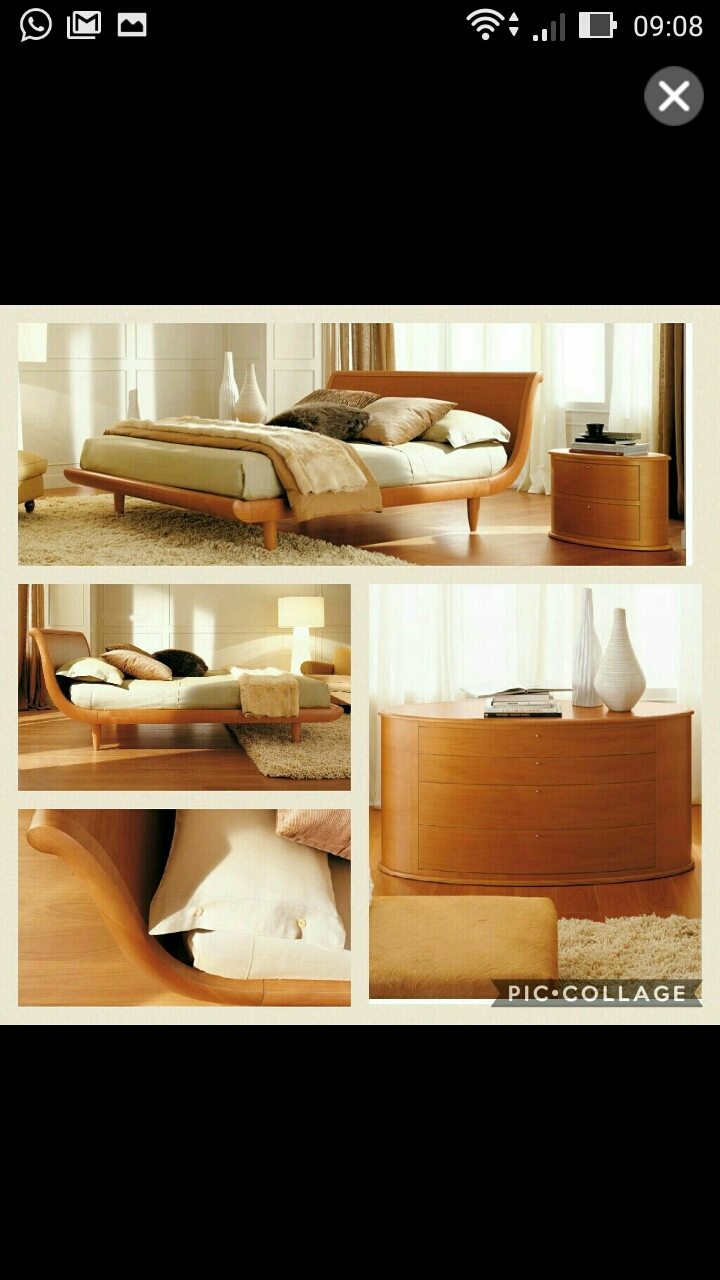 Letto in finitura di ciliegio, testata multistrato curvato, struttura in legno massello, 2 comodini ovali, comò con specchiera,piacevole da ambientare in case decisamente moderne. Vendesi in blocco. FALEGNAMERIA 1946