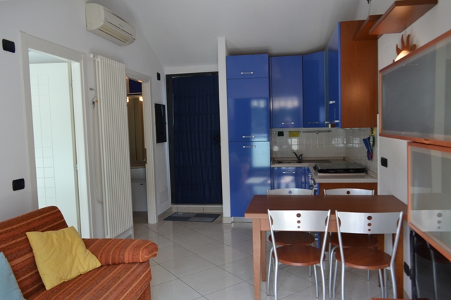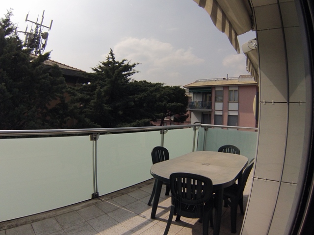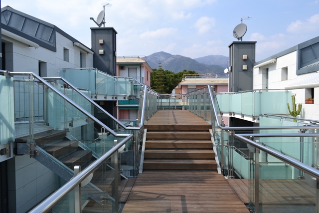 Posizione geografica favorevole per il periodo invernale con la prima terrazza di mq. 10 tutta ad Ovest oltre ad una tranquillità proporzionata alla centralità; tramite le scale esterne in legno ed acciaio si arriva alla parte terminale della passerella e si accede al primo balcone di mq. 8 ove è stato ricavato anche un vano tecnico di ricovero della caldaia a metano per la produzione dell’acqua sanitaria e riscaldamento autonomo; entriamo nel soggiorno con attigua la camera ed entrambi i locali hanno l’uscita sulla terrazza; disimpegno con ripostiglio dedicato in parte anche per la lavatrice e cassaforte, bagno con doccia angolare e finestra.