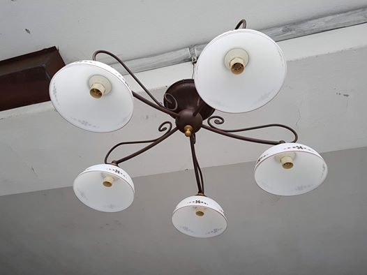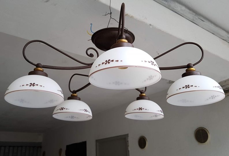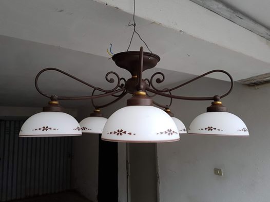 Bellissimo lampadario antichizzato a 5 punti luce con coppe in vetro.