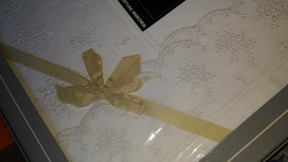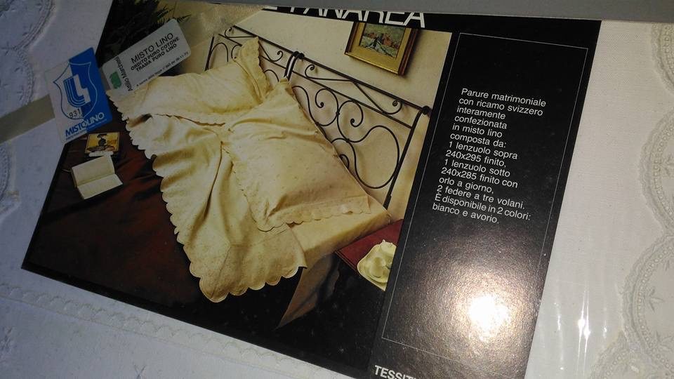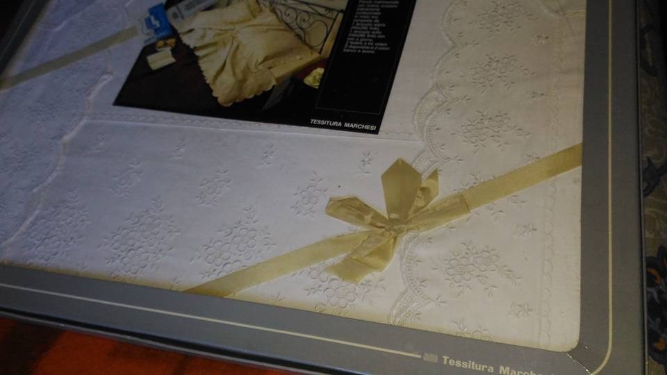 Tovaglia bianca in puro lino ricamata a mano. Nuova ma con confezione danneggiata + 12 tovaglioli