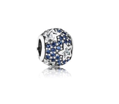 Charm originale Pandora, sfera in pavé blu. “Segui le stelle”, in argento con pietre blu e stelle. Codice charm 791382CZ
