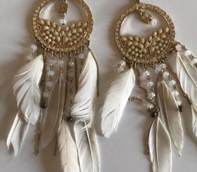 Orecchini lunghi con cristalli e piume stile hippy chic in perfette condizioni