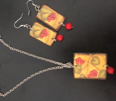 Collana e orecchini in legno leggerissimo, decorati con decoupage e pietre dure.