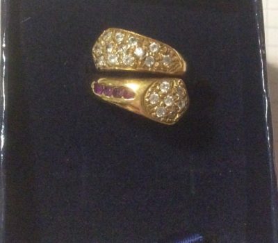 Anello contrarié in oro 18 kt con zirconi rosa e bianchi. Usato in perfetto stato. Peso 7 gr circa.