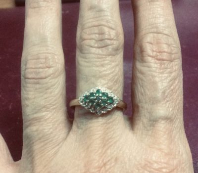 Anello in oro 18 kt, platino, diamanti e 9 smeraldi. Usato in perfetto stato. Peso 2,60 gr.